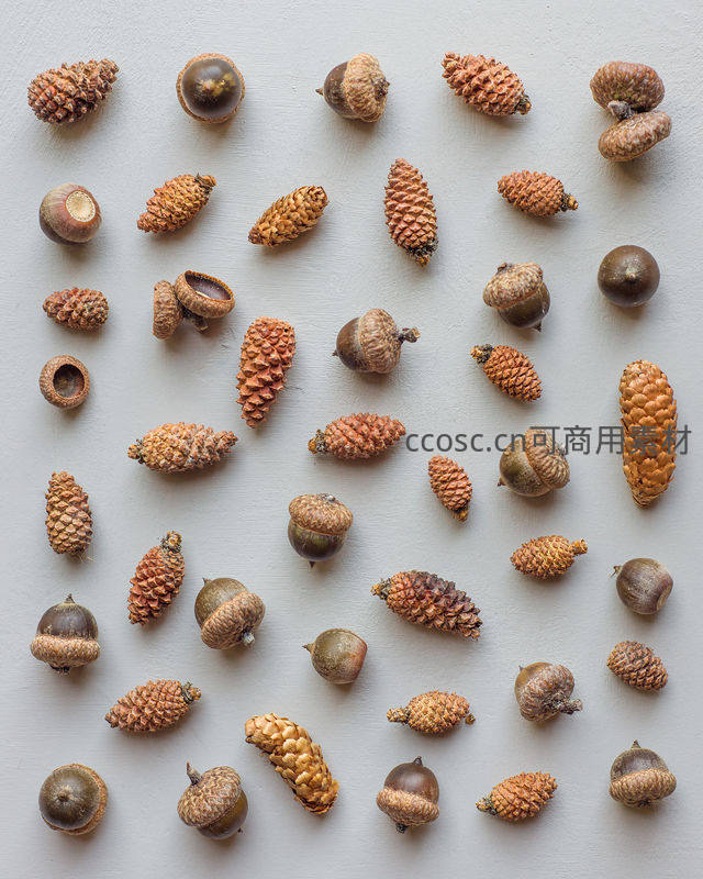 俯拍视角下,大小不一、形态各异的松果与橡果散落在纯色背景上,展现其天然的纹理与质朴之美,是秋季丰收的微观缩影。