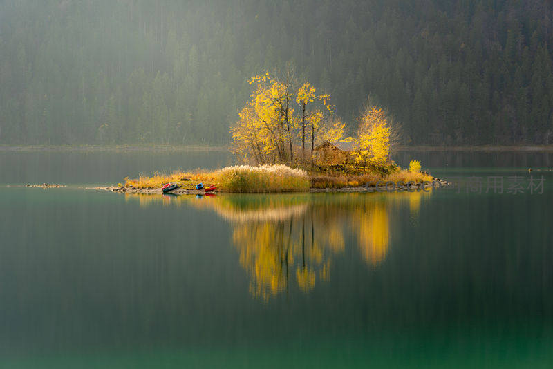 湖心小岛秋色:金色树林倒映碧水间