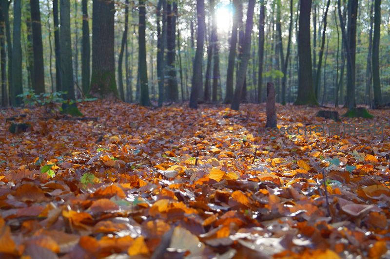 温暖的阳光穿过高耸的树冠,在铺满橙红落叶的林地上洒下斑驳光影,营造出静谧而充满生机的秋日森林氛围。