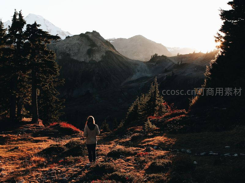 远眺雪山之巅,旅人独行于秋色山野