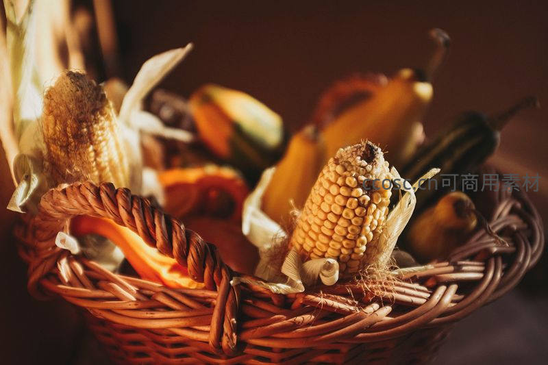 一个编织精美的柳条篮里盛满了刚收获的玉米、南瓜和葫芦等秋季作物,暖色调光线突显了丰收的喜悦与质朴的田园气息。