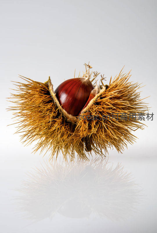 一颗成熟的栗子从金黄色的带刺外壳中自然裂开,露出光滑油亮的深红色果仁,背景纯净,倒影清晰,尽显秋日丰收之美。