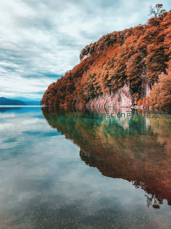 澄澈湖水如镜,完美倒映着岸边层林尽染的秋山与天空流云,构成对称的视觉奇观,展现大自然的宁静壮丽。