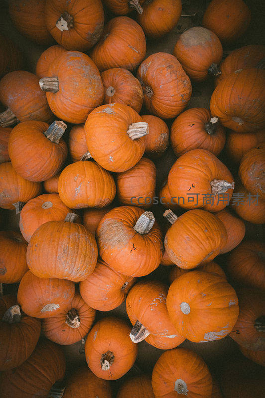 大量饱满圆润的橙色南瓜紧密堆叠在一起,表皮带着泥土的痕迹,散发着浓郁的秋日气息,象征着农业的丰收喜悦和即将到来的节日庆典。