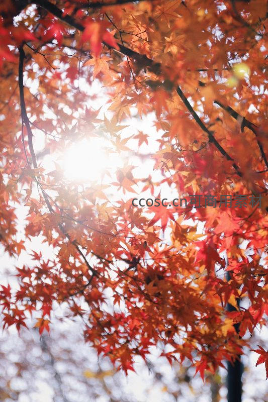 阳光穿透绚烂枫叶林间光影