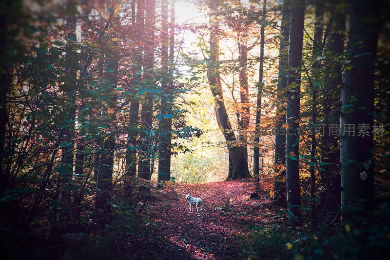 森林小径上斑点狗沐浴金色阳光