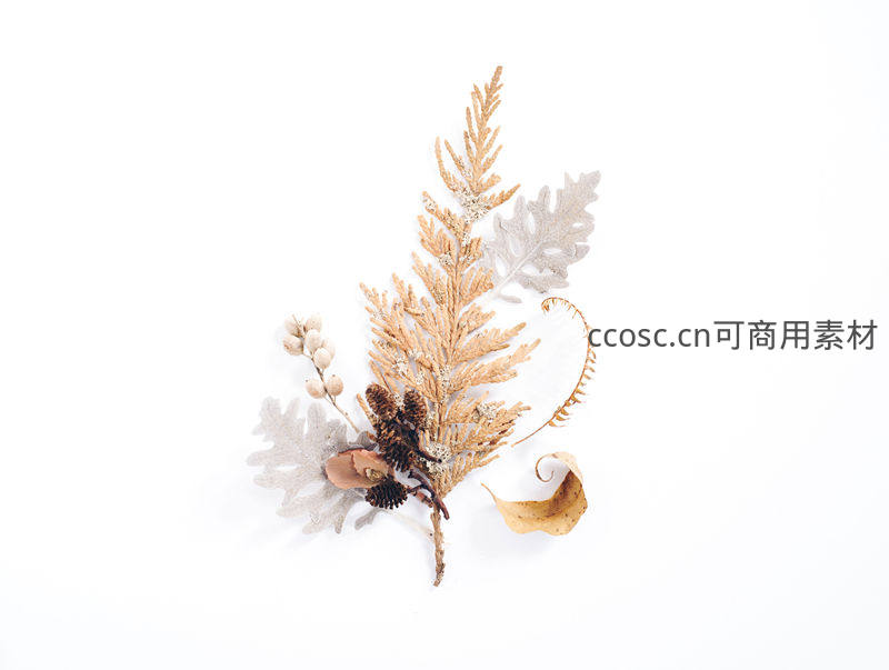 在纯白背景下,几枝经过处理的干枯蕨类、橡树叶和松果巧妙组合,呈现出简约而不失质感的秋日装饰风格,适合家居或平面设计灵感。