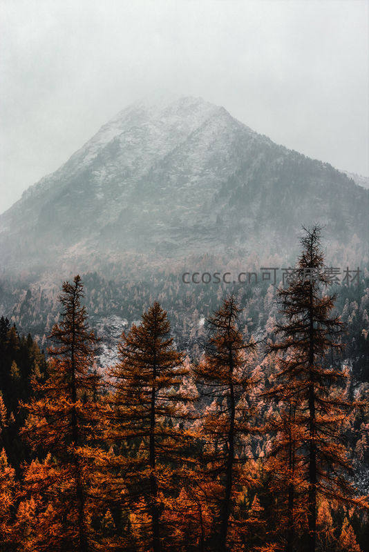 雾霭山峦与橙红针叶林,秋冬交替的壮丽画卷