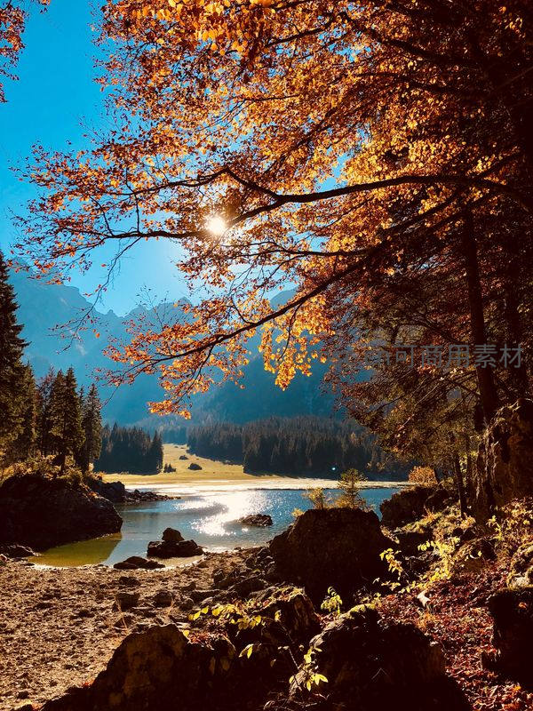 清澈的湖水倒映着远山和蓝天,近处的树枝挂满金黄秋叶,阳光穿过缝隙洒在水面,岩石与落叶点缀岸边,构成一幅壮丽而宁静的山水画卷。