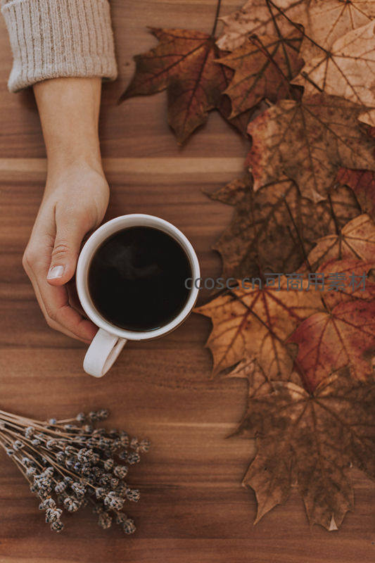 一只温柔的手握着热咖啡杯,周围散落着干枯枫叶和薰衣草束,木质桌面上弥漫着秋日午后慵懒而温暖的生活气息。