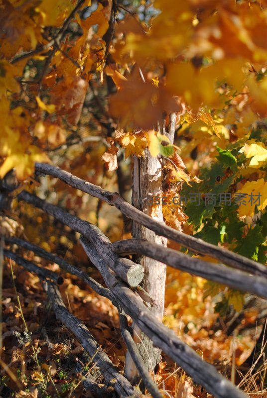木栅栏旁秋叶斑驳光影