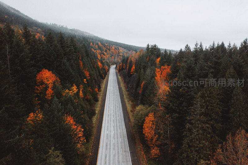 从高空俯瞰,一条笔直的公路如丝带般穿梭在层林尽染的秋日森林中,橙红与墨绿交织,展现大自然壮丽而和谐的色彩画卷。