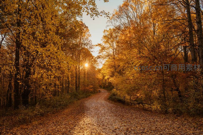 夕阳西下,金色光芒穿透茂密的秋叶林,洒在铺满落叶的小径上,远处隐约可见行人身影,整个画面弥漫着温暖祥和的秋日气息。