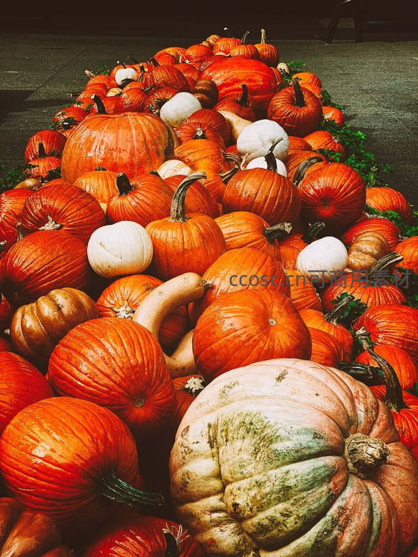 各式各样的南瓜堆积如山,橙色与白色交相辉映,展现出秋季丰收的喜悦和节日的浓厚氛围。