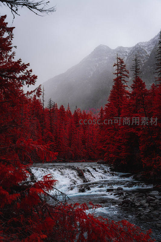 层叠的红色树林在薄雾笼罩的山峦下,一条湍急的溪流穿行其间,构成一幅奇幻而宁静的自然画卷。