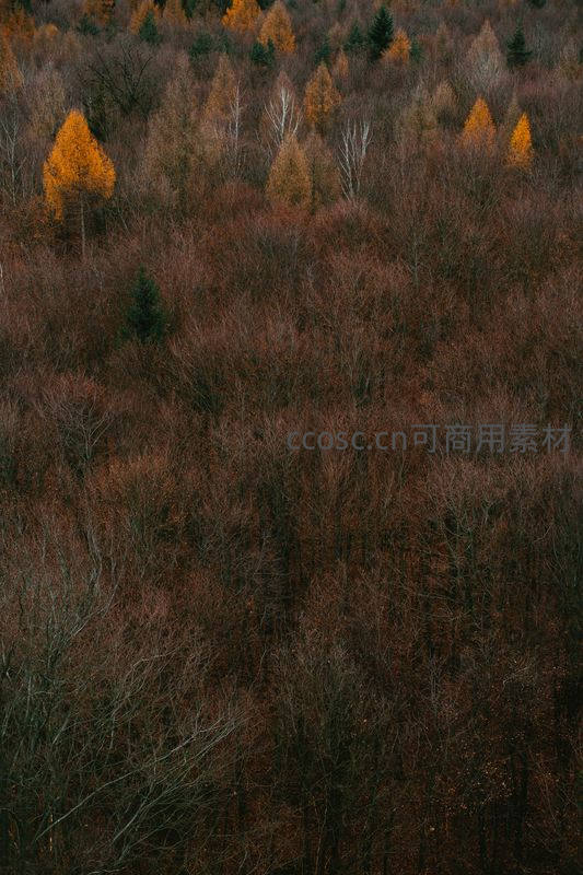 从高空俯瞰,连绵起伏的山林被秋色浸染,大部分树木已褪去绿装,呈现出深褐与暗红的基调,几抹明亮的金黄点缀其间,构成一幅辽阔而苍茫的季节画卷。