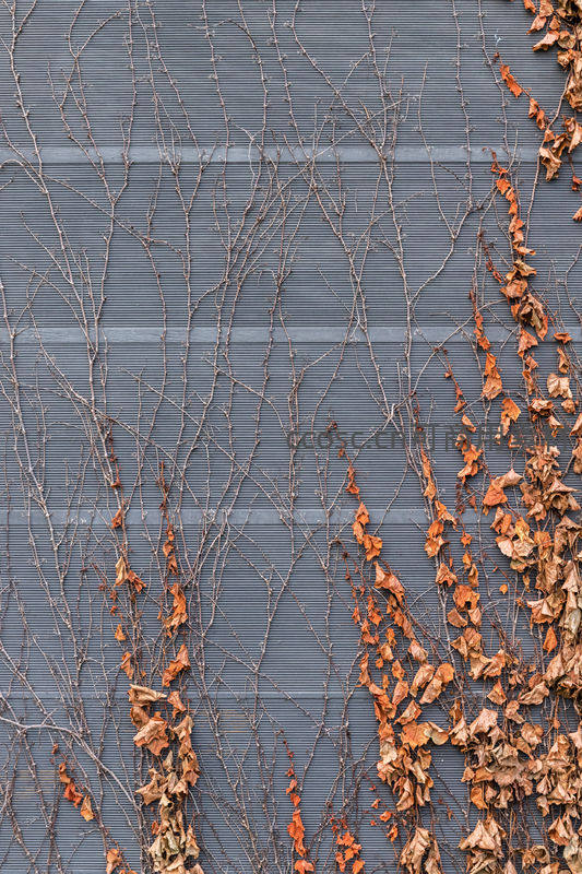干枯的藤蔓爬满带有水平条纹的灰色墙面,右侧残留几簇焦糖色落叶,形成强烈视觉对比,传递萧瑟而富有质感的秋日气息。
