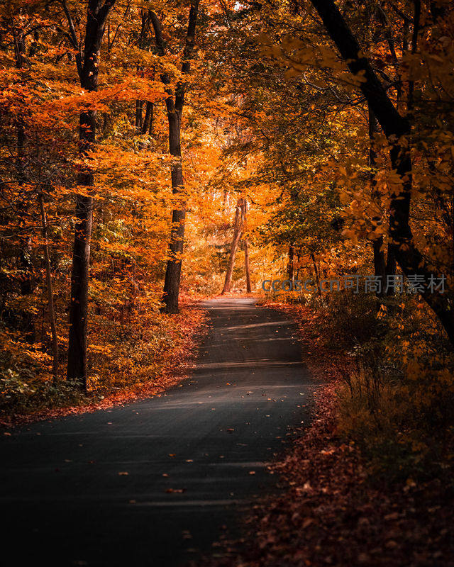 一条蜿蜒的小路穿过层林尽染的秋日森林,金黄与橙红的树叶在阳光下闪耀,营造出静谧而温暖的季节氛围。