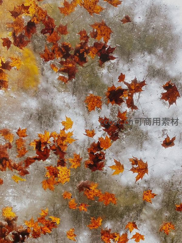 透过晶莹剔透的冰层,金黄与深红的枫叶仿佛被时间定格,形成独特的自然抽象画,展现了秋冬交替时的静谧之美。