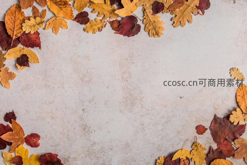 多彩的枫叶与橡树叶巧妙排列在浅色纹理背景的四角,形成自然优雅的边框效果,适合作为贺卡、海报或社交媒体的文艺风视觉素材。