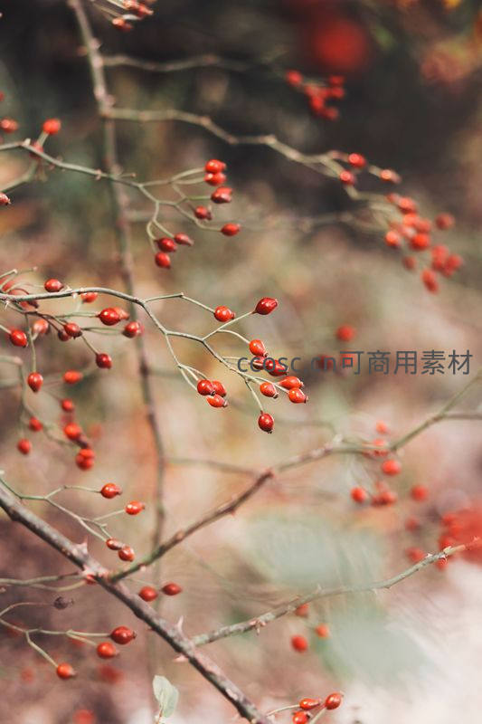 镜头聚焦于一簇挂满鲜红浆果的细枝,背景虚化突出果实的饱满色泽与质感,展现秋日野外植物的细腻之美与生命力。