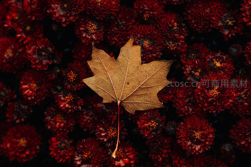 一片干枯的枫叶静静躺在深红色菊花丛中,形成鲜明对比,展现了秋日特有的宁静与萧瑟之美。