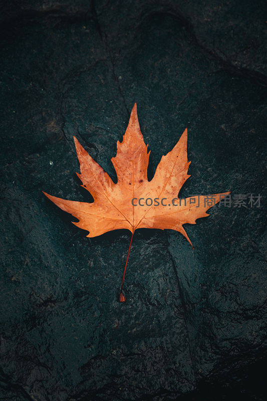 一片橙红枫叶静静躺在深色岩石表面,脉络清晰可见,背景沉静,凸显季节更替中那份孤独而优雅的美感。