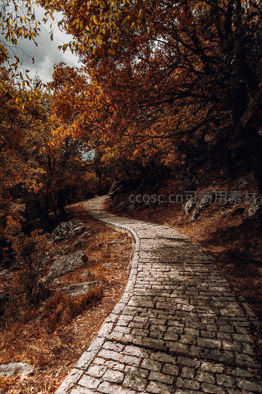一条古朴石板小路在秋色浓郁的树林中曲折延伸,两旁树木金黄火红,落叶铺地,营造出静谧深邃的秋日山野意境。