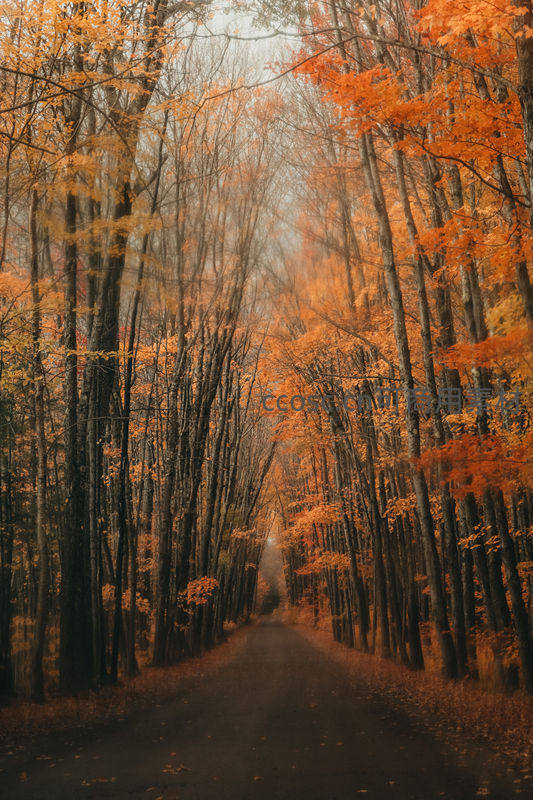 一条蜿蜒小路伸向远方,两侧是层林尽染的枫树,薄雾弥漫其间,渲染出一种神秘、静谧又充满诗意的深秋意境。