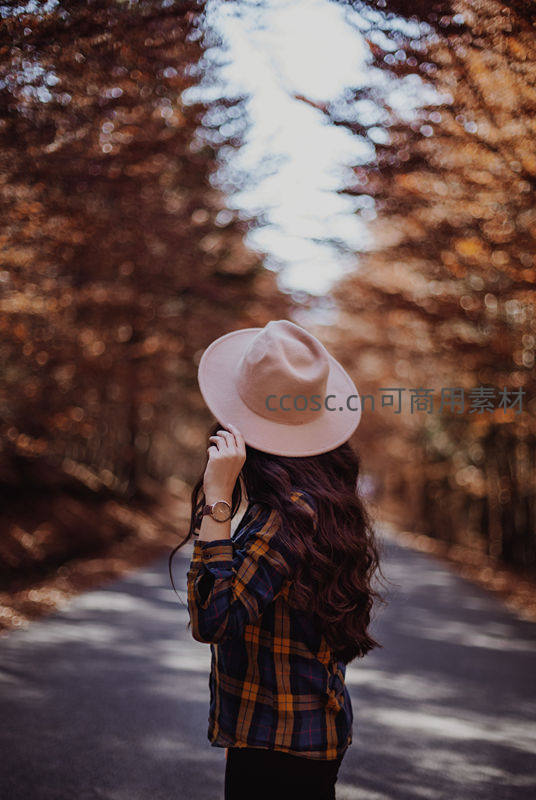 一位长发女子戴着浅色帽子站在林荫小道上,背对镜头,手扶帽檐,阳光透过金黄树叶洒下斑驳光影,营造出静谧温暖的秋日氛围。