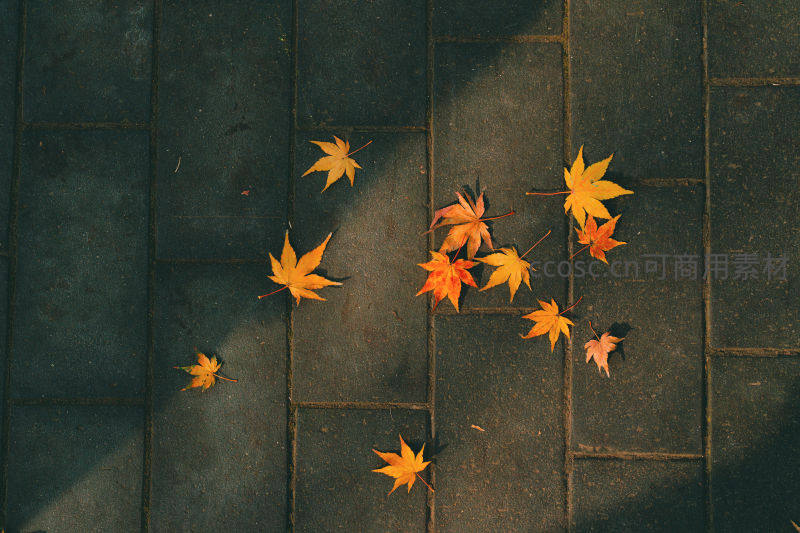 石板路上散落的枫叶秋景