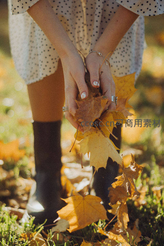 一位女士在铺满金黄落叶的草地上,弯腰拾起几片枫叶。她穿着波点上衣和黑色长靴,画面充满秋日的宁静与诗意。