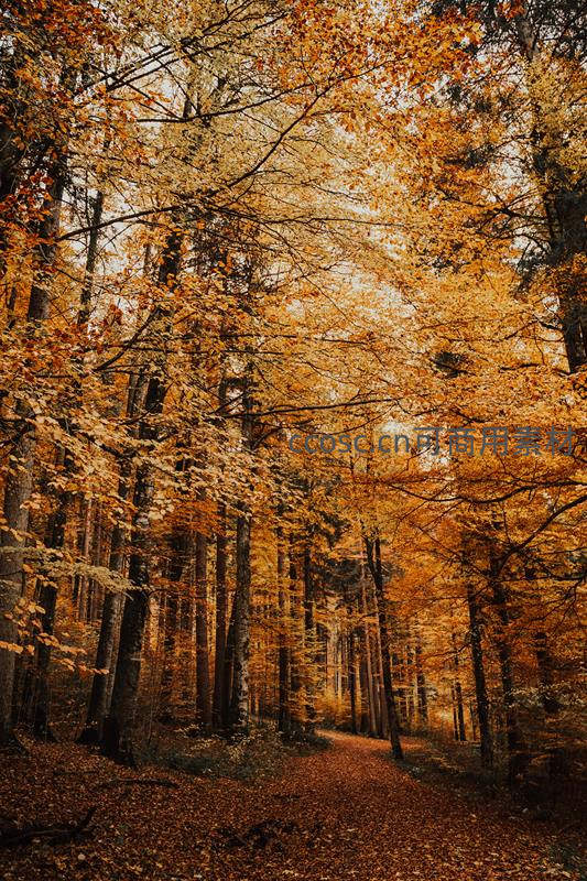 笔直的小径被两侧高耸的树木与浓密的金色叶片环绕,形成天然拱廊,阳光穿透缝隙,在地面投下温暖光斑,营造梦幻氛围。