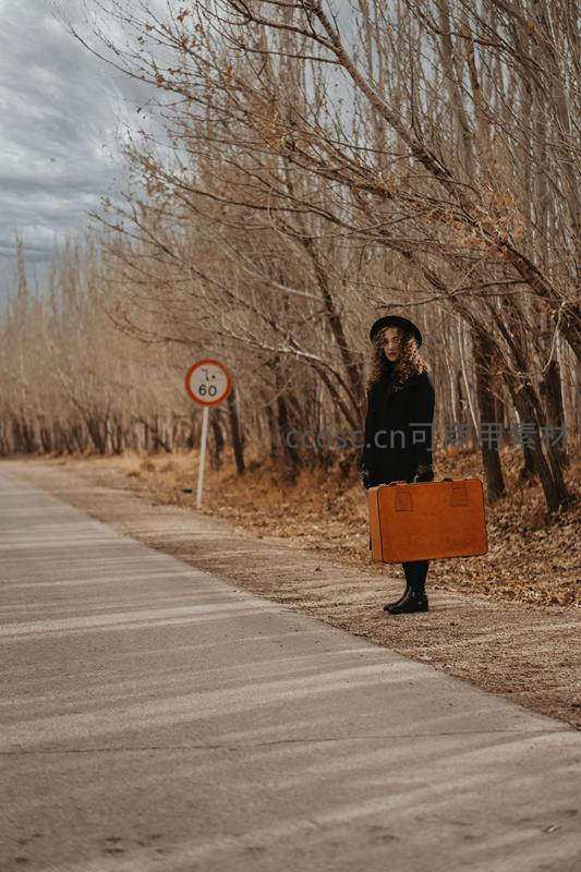 一位戴着帽子的女子提着复古行李箱,独自站在萧瑟的乡间公路上,背景是光秃的树木和阴沉天空,充满离别与远行的故事感。