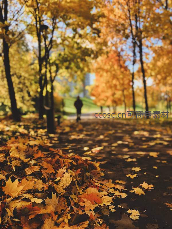 一条铺满金黄落叶的小径延伸向远方,一个模糊的身影在树影斑驳的公园中漫步,整个画面充满了秋日特有的诗意与浪漫。