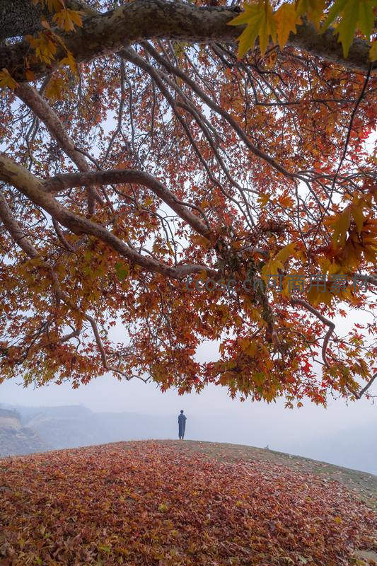 一人伫立铺满红叶的山坡上,头顶枝叶斑斓,远山云雾缭绕,画面充满诗意与哲思,展现人与自然的静谧对话。