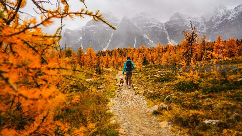 一位背包客带着爱犬行走在铺满金黄落叶的山间小径上,远处是云雾缭绕的雪峰,展现了人与自然和谐共处的壮丽秋日远足画面。