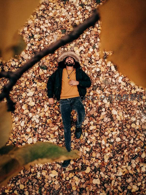 一名男子惬意地躺在厚厚的落叶堆中,仰望天空,享受着秋日独有的宁静与舒适,画面充满生活气息。