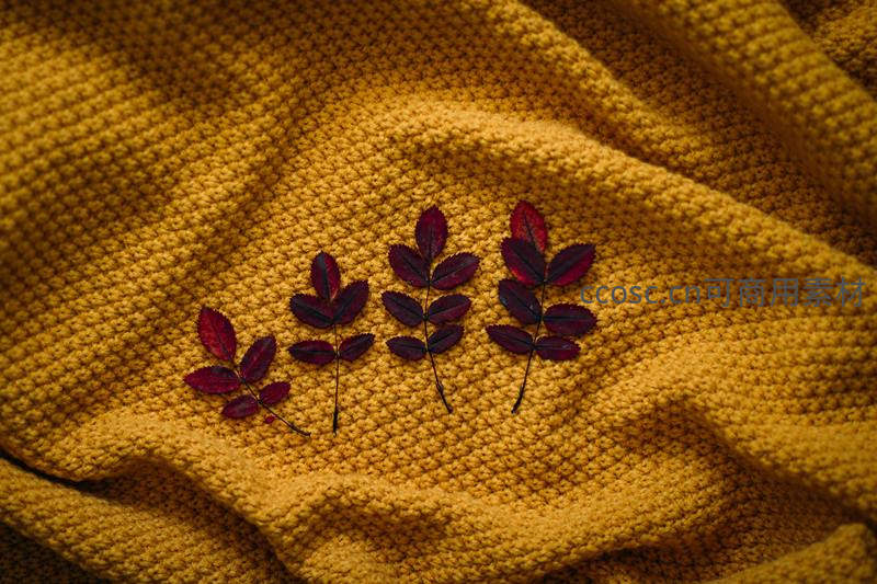 几片深红色的秋叶整齐摆放在黄色针织毛毯上,微距特写展现细腻纹理与季节色彩的温柔对比。