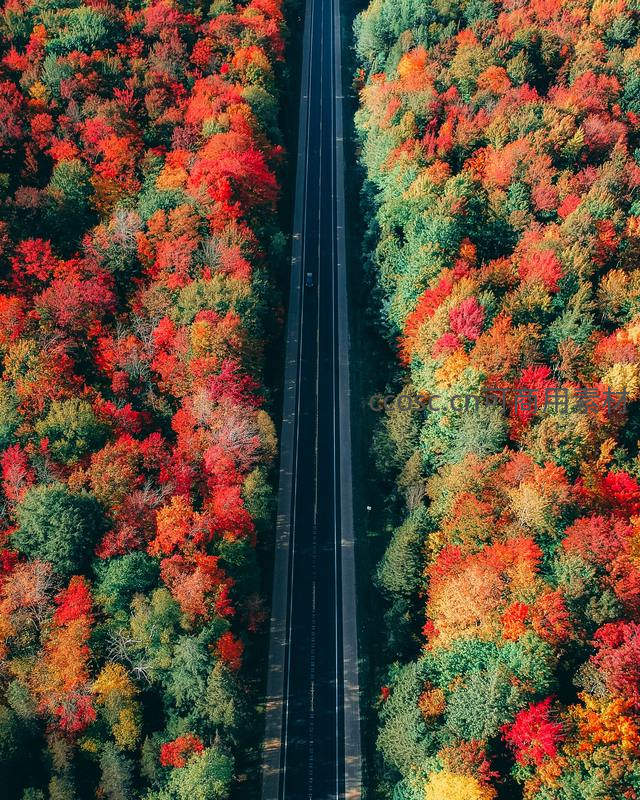 从高空俯瞰,一条笔直公路如黑色丝带贯穿于燃烧般绚烂的秋日森林,红、橙、黄、绿交织,是自驾旅行者梦寐以求的视觉盛宴。