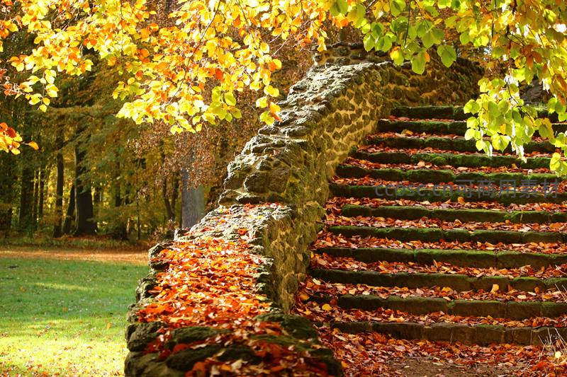石阶覆满秋叶,古墙旁阳光洒落林间