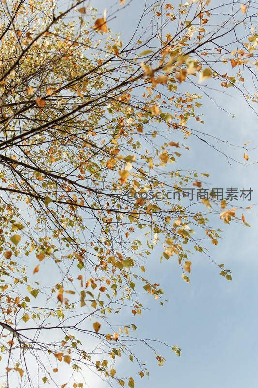 从下往上仰拍,纤细的树枝伸向淡蓝天空,叶片已染上金黄与浅绿,微风轻拂,展现秋日天空下的自然诗意。