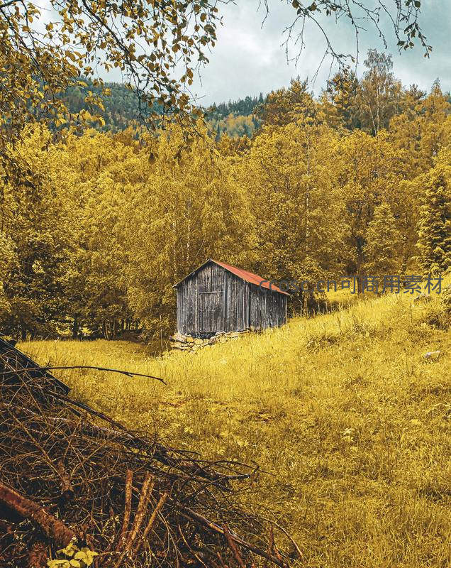 一座古朴木屋静立于金色秋林环抱的山坡上,红顶与黄叶相映成趣,远处山峦层叠,营造出远离尘嚣的田园诗意氛围。