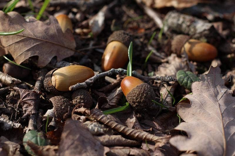 橡果散落枯叶间新生嫩芽初现
