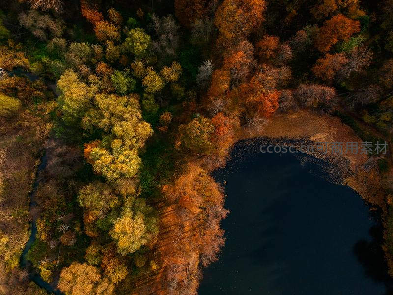 从高空俯瞰,秋日的森林与静谧湖泊相映成趣,树叶呈现出金黄、橙红、深绿等丰富色彩,宛如一幅天然的油画,宁静而壮美。