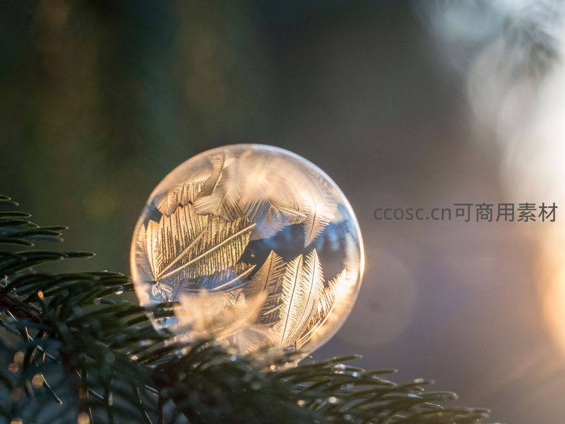 在冬日的松枝上,一颗透明的冰晶泡泡静静悬挂,内部凝结着精致的羽毛状冰纹。温暖的阳光从后方穿透,将冰冷的晶体染成金色,营造出宁静而梦幻的氛围。