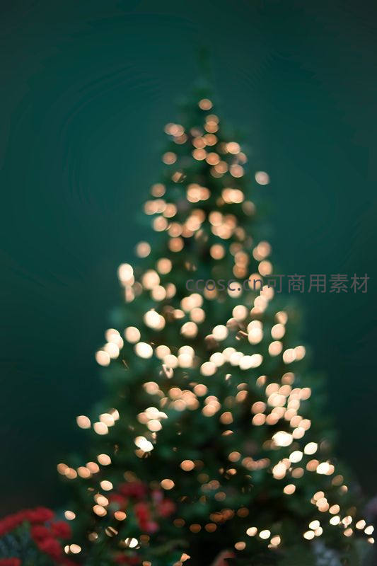 整棵圣诞树被拍摄成一片梦幻的金色光斑,背景为深绿色,营造出一种朦胧、浪漫且充满节日魔法的艺术感。