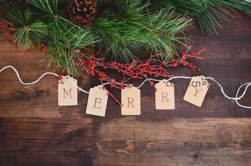 木质桌面上铺着翠绿的松枝与鲜红浆果,悬挂的纸牌拼出MERRY字样,营造温馨自然的节日氛围,适合用作圣诞主题装饰或贺卡设计。