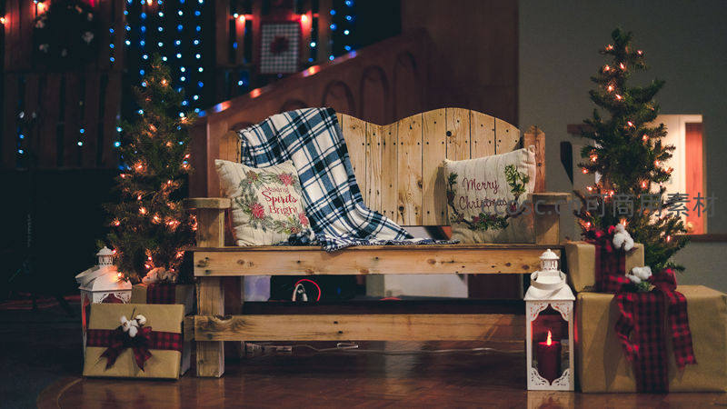 一张木质长椅上摆放着格纹毯子和印有圣诞祝福的抱枕,两侧点缀着小圣诞树和礼品盒,暖黄灯光营造出舒适宜人的节日休憩空间。