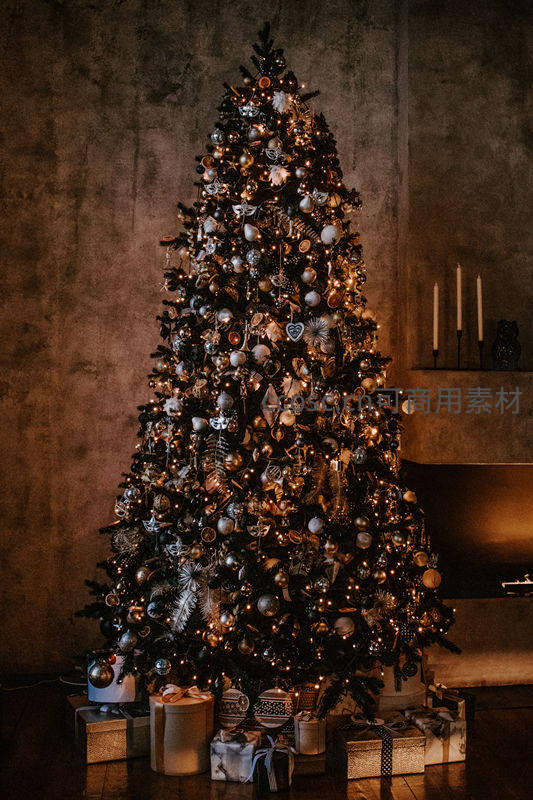 一棵高大华丽的圣诞树以银黑为主色调,缀满金属质感饰品与暖光灯串,底部堆叠精美礼盒,背景烛台增添复古优雅氛围。